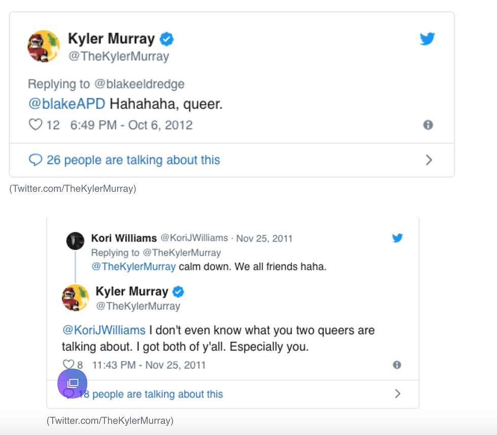 We can all agree that the tweets (shown below) are unacceptable, and there's no questioning that. However, those words were tweeted as an adolescent still learning what and what not to say in today's world. Putting this young man on blast for the sake of headline news is just as immoral to me. The tweets could be worse. They are not directly attacking anyone in any way, just more of a poor choice of words which a lot of us have done at some point in our life. Other professional athletes have had old racist/offensive tweets surface recently, and I think in comparison with Murray's - the others were more worthy of public scrutiny.